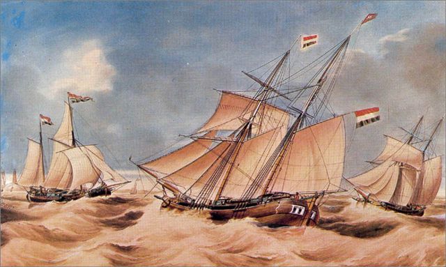 The MONNICKENDAM according the web-site of the Maritiem Museum in Rotterdam who owns the painting is depict, with on the left of her the VERWACHTING not visible on the stamp, also there are in few small alternations in the design between the stamp and the painting.