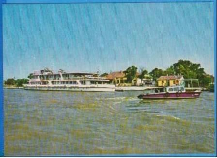 A hydrofoil of the type Raketa is seen on the river in the margin of the sheet, also a cargo vessel.
