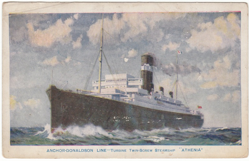 ATHENIA. Passenqer. Built by Fairfield Shipbuilding & Engineering Co. Govan. Launched 1923. Built for Anchor Donaldson Ltd. L526'3" B66'4" Dr38'1". 13,581tons. Double reduction steam turbines. 2 screws. 15 knots. Passengers 516 Cabin, 1,000 third class. (later 314 cabin, 310 tourist and 928 third class) Anchor-Donaldson became Donaldson Atlantic Line in 1935. She was the first Passenger ship sunk in WW2 (on the opening day of the war), shown on the stamp presumably with Submarine U-30 which sank her. Sailing from Glasgow, about noon for Montreal on 1 Sept. 1939 commanded by Capt. James Cook, calling at Liverpool and Belfast to embark Passengers, 1418 persons were on board, 1103 were Passengers, and 311 were Americans. On the evening of the 3rd, 250 miles west of Inishtrahull, Donegal she was torpedoed. War with Germany had broken out only a few hours before. Soon after the explosion the Submarine surfaced and from 800 to 1000 yards fired two shells in order to silence the radio. By this time the ship had taken on a list making it difficult to lower the boats. Some days later after the survivors had landed Donaldson Line announced that 128 persons had lost their lives. It was reported that Lt Commander Lemp torpedoed the ship without giving any warning. The U-30 was one of a number of German Submarines which were scuttled in Flensburger Fjord on 4-5th May 1945. Doubt has arisen that the vessel depicted in the background of this sheet is a correct identification. Two funnels can be seen whereas the ATHENIA only had one. Two books confirm that ATHENIA had one funnel, The Atlantic Liners 1925- 1970 by F Emmons and Great Passenger Ships of the World, Vol 2 by Arnold Kludas - Grenada 1990. $6 SG2119 Min. Sheet (P Snijers E J Hogan)