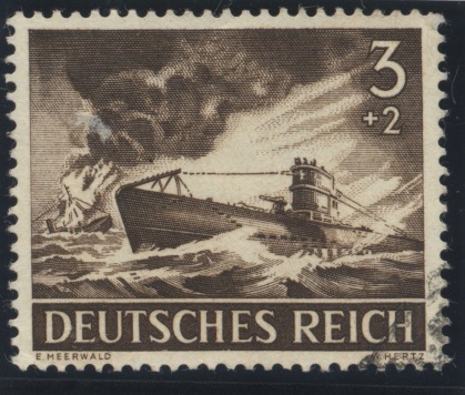 GERMANIA. Submarine U-45. German Navy. Built at Germania Yard, Kiel. Commissioned 27th April 1938. Displacement 760tn. L220'. B20'. Dr15'. Armed with One 3.5". One 1pdr AA guns. Five 21"TT. Two sets of MAN diesel engines. 2800hp. 17kn(surfaced) Electric motors 750hp. 8kn(submerged). She was sunk off the West of Ireland by British Destroyers on 14th October 1939. - Germany 1943. 3+2pf SG819 (Woad)
