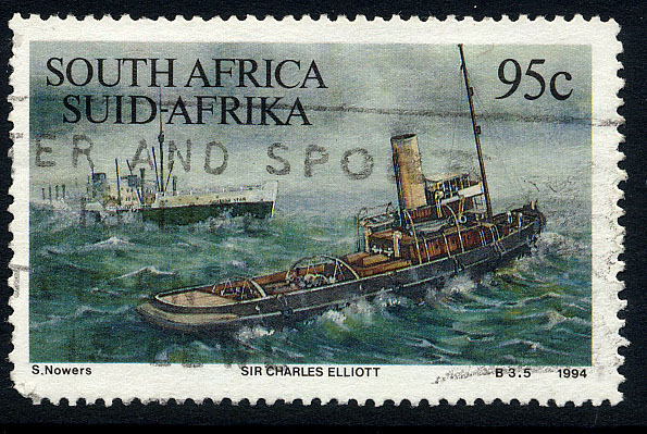 History/Notes: The Table Bay Harbour Board's last purchase was put into service in Table Bay in 1902. She was named after sir Charles Elliott, General Manager of the Cape Government Railways. She was a bit of a disapointment to some because of her retum to compound engines and her single funnel. In 1926, she was transferred to Walvis Bay and was wrecked on Rocky Point off the Skeleton Coast on 3rd December 1942 after having assisted the sinking Dunedin Star (which had gone aground near the mouth of the Kunene river on the Angolan border), unfortunately some of her crew did not make the shore . The stamp shows the Sir Charles Elliott and the Dunedin Star. - South Africa 1994 95c SG846