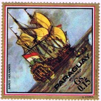 The stamp of Paraguay issued in 1974 15c shows us a detail of the painting made by Abraham Storck (baptized in Amsterdam on 17 April 1644 and buried there 08 April 1708) which shows us Czar Peter of Russia in route to the newly built frigate PETER EN PAUL of the Dutch VOC on the Y off Amsterdam in 1697. Details of the ship you can find when you click on the shipsname in the index.