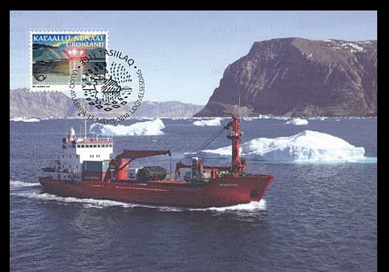 The maxi chart gives the PAJUTTAAT, the stamp is very unclear but most probably the same vessel is depict on the stamp, sailing during the night in waters were growlers are floating around the reason she has on the forefront of the bridge three search lights. I have been sailing many years in the waters of Newfoundland were we have had the same problem during the night, icebergs you could easily pick up on the radar screen but the floating pieces of ice (growlers) some heavy, were very difficult to find and could easily hole the bow of your ship when hit.