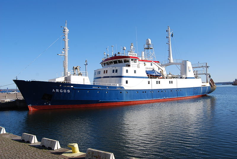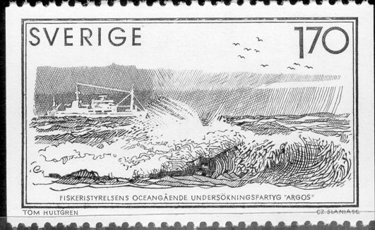 Watercraft Philately has in Volume 26 page 45: Sweden issued a booklet of five 170-øre stamps, commemorating Sea Research. Czeslaw Slania engraved the designs and the stamps were printed in Holland by photogravure and steel print. The booklet was sold with a surcharge of .95kr for the benefit of stamp collecting. One of the stamps depicts, in the distance, the sea research vessel ARGOS. She is the third in the series of these vessels. She is classed Norwegian Veritas 1-A-1 stern trawler, ice-C. Constructed as a stern-trawler without a slipway, she is specially equipped for marine research. The working deck astern is equipped for trawling. She has a "wet lab" for collecting water samples, a "dry lab" and a computer room. A low-frequency echo sounder is used for hydrographic, a medium frequency for bottom fishing, and a high-frequency sounder with an integrator for the determination of the occurrence of pelagic fish species. The vessel's primary purpose is to serve as a base for the fishery, scientific, and hydrographic expeditions made by the Board of Fisheries through the Institute of Marine Research. The name is from the 100-eyed monster of Greek mythology, which, even while sleeping, always had at least one of its eyes open to keep watch.