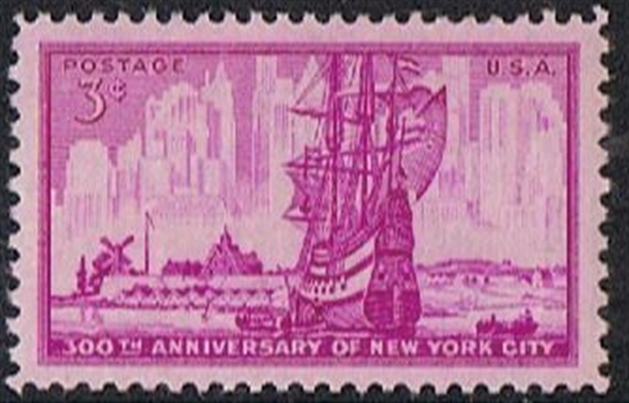 Issued to commemorate the 300th anniversary of New York City, U.S. #1027 pictures an artist’s representation of the town of New Amsterdam in the early days of settlement. The stamp pictures a Dutch ship in the harbor with an outline of a modern New York City skyline in the background.