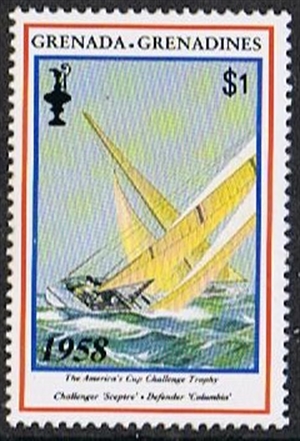 Grenada of Grenadines 1992 $1 sg1582, scott1479. (Other yacht is the COLUMBIA US 16)
