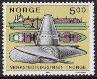 Norway issued on 21 February 1991 one stamp of 5.00Kr which shows plans of a L.N.G. (Liquefied Naturel Gas Carrier), a tanker which can transport liquefied naturel gas.