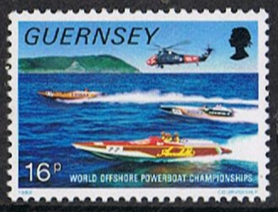 A further important element of the 32p stamp denomination as well as of the 16p showing Jethou in the distance, is the Royal Navy Rescue helicopter. The safety of competitor’s spectators and organisers must be the priority in a high speed event such as powerboating. In addition to the Wessex helicopter from RNAS Culdrose in Cornwall which is present for the week there are in attendance the local RNLI Arun class lifeboat and the St John Ambulance’s launch FLYING CHRISTINE.