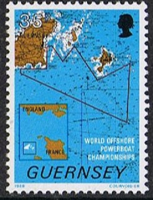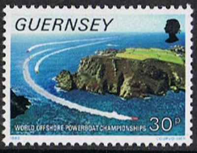 The course shown on the top value represents that for the World Championship events. During Powerboat Week other prestigious races are held, including those for the Guernsey Cold and Cruiser Championships. Since speed is somewhat reduced for the latter, craft will be allowed to race through the spectacular Gouliot Passage which separates Sark from Brecqhou: this manoeuvre is shown on the 30p.
