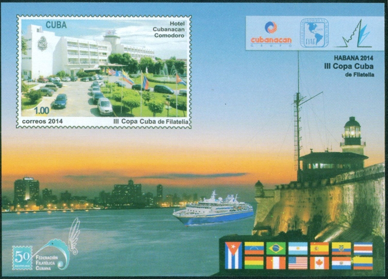 For the International Philatelic Havana Cuba Cup 2014, Cuba issued a miniature sheet with in the margin a cruise vessel entering the port of Havana.