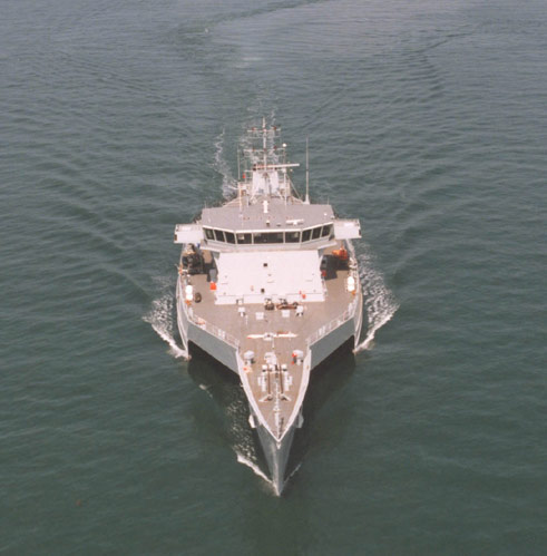 TRITON was designed as a demonstrator to prove that the trimaran concept would work successfully in a large warship. Following her launch in 2000, the ship began an extensive series of trials in 2001, which covered general ship handling, performance, sea-keeping behaviour, but also areas more specific to its design for which the Royal Navy had no experience. For example, a series of docking manoeuvres were undertaken by the pilot boats of HMNB PORTSMOUTH to determine the problems of docking a large trimaran, and the ship underwent underway replenishment alongside HMS ARGYLL and the tanker RFA BRAMBLELEAF to ascertain the characteristics of a trimaran and a monohull replenishing at the same time. TRITON also undertook the first helicopter take off and landing on a trimaran.