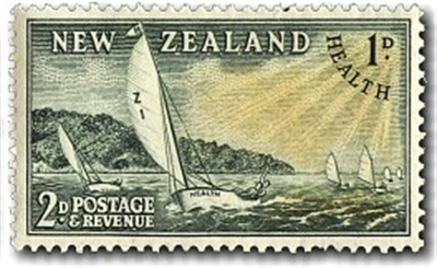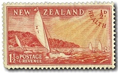 By this two stamps is given by the New Zealand Post: A race between small yachts set against a typical New Zealand coastal scene with the sun’s rays prominently radiating from the top right-hand corner, is depicted on the 1951 Health stamps. The yachts are racing for the Cornwell Cup, a trophy donated in memory of John Travers Cornwell VC, killed in the Battle of Jutland in 1916.