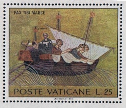This stamp issued of L25 by the Vatican in 1972, shows us a Venetian merchant ship from around 800 in which the body of the apostle St Mark is transported from Alexandria to Venice. Have not any info on the depicted vessel but below is given the voyage from Alexandria to Venice what I did find on the internet. The stamp is designed after a mosaic in the basilica of San Marco in Venice.