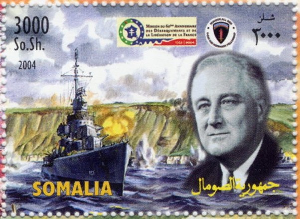 In the June 2006 issue of the USNI’s Naval History there is an article called ‘To Honour Our Navy at Normandy’. The first page of the article shows a painting entitled The Battle for Fox Green, D-Day Normandy by Dwight C. Shepler. The scene shows USS Emmons (DD 457) using her five-inch guns to shell targets at the eastern end of Omaha Beach, and is the design used for the stamp issues.