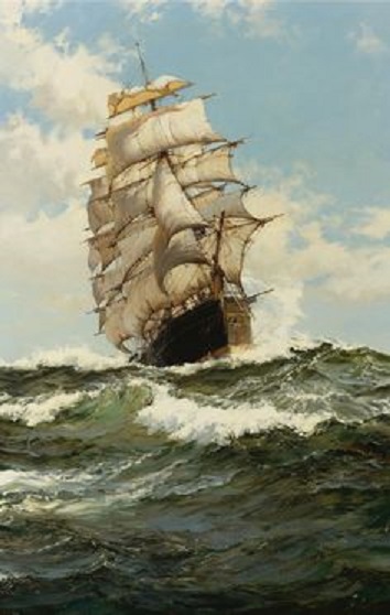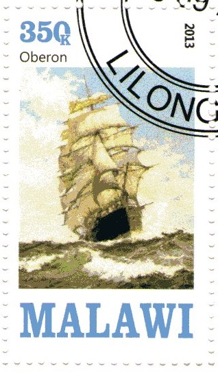 Basil Lubbock in his book "The Chine Clippers" writes: Before turning to the tea race of 1870,I must say words about “Oberon”,the ship which Captain Keay left “Ariel” to take command of. ”Oberon”was experiment of Maxton’s,one of those failures as auxiliary steamers which, when their screws were remowed,proved very fine sailing vessels.It is curious that this was by no means uncommon with early full-rigged steamers.The mention of the following names,the “Tweed”,”Oberon”,Daeling Downs”,”Lady Jocelyn”,and “Lancing” will show how successful the steamship design has been under sail. But her best speed under steam,at a coal concumption of 7 tons a day,was only 7 knots an hour,and she proved to be quite unable to stem a strong head wind and sea. She cost 35000 to build,and thus was a very constly experiment.Her black squad consisted of two engineers and three firemen.These poor wretches had a very bad time in the tropics,as in those days the ventilation of engine room and stokehole was most primitive.Capitain Keay,after a very worrying voyage, managed to get her home from Hankow via the Cape in 115days.He then left her for another troublesome steam kettle. Oberon's second voyage, with a less experienced captain, was an even greater disappointment than her first. She started well by making Port Said under sail alone in 18 days from Plymouth. The sails were then put in the gaskets and steam raised for the passage of the Canal and Red Sea. All went well until she was nearing the southern end of the Red Sea, when a strong southerly wind absolutely stopped her headway. Hoping that this would soon take off, the captain anchored off Mocha. But eight days passed and still the southerly wind blew as strong as ever, so Oberon was at last compelled to beat through Laage Strait under both steam and canvas. This soon consumed her limited supply of coal, and she was obliged to put into Aden to refill her bunkers. Coaling was again a necessity at Labuan. Her next trouble was going up the Yangtze to Hankow. With great difficulty she managed to stem the 7 -knot current as far as the Orphan Rock, but here the current became so fierce that her headway was completely stopped. Thereupon her engineer did what many another engineer was compelled to do in those early days of the steam engine, he jammed down the safety valve and raised the working pressure from 30 to 45 lbs. This desperate expedient just got her past the Orphan Rock in safety. On the homeward run she took 134 days from Hankow via the Cape. Two such voyages were enough. Her machinery was removed, and hence- forth she depended on sail alone with infinitely better results. The Obеron is a composite ship, and a glance at the vessel below shows that for strength nothing can surpass her. Her planking, of teak-wood, is as smooth as glass, and, with her beautiful entrance and fine ran, there Is nothing to prevent her from sailing. ”Oberon” was heavily rigged with three skysail yards,and when under sail alone proved a very fast,handy vessel and splendid sea boat.Her great length (241 feet, with a beam of but 36 feеt.) gives her good sailing power, and that she possesses this power In a remarkable degree has been fairly proved by various performances, which we give as follows : She made a voyage from Melbourne to London in 74 days and from Sydney to Melbourne in 8O days ; was 76 days from London to New Zealand ; made a voyage from this port lo Liverpool in 91 days, and came from Hongkong to this port In 37 days. One of her most remarkable performances was her last round voyage from London to New Zealand, and thence to this port in 121 sailing days, considerable less than the average of passages from New York or England direct to this port. The design of the Malawi stamp is made after painting of Montague Dawson.