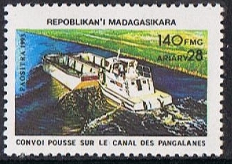 This stamp shows us a tug pushing two barges on the Pangalanes Canal, Madagascar. The photo I found on the internet shows the tugs alongside in a terrible state and not more in use, the barges are now most probably used by the locals. On the photo there is one visible at shore on the top of the photo. Have not more info on tugs and barges.