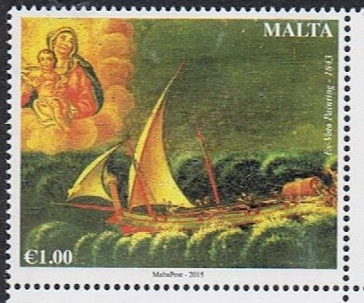 The 1.00 stamp depicts an Ex-Voto made by Captain Giuseppe Diacono and his crew of the Speronara (sailing coaster) 'S.FRANCESCO DI PAULA to the Blessed Virgin of Melliewhen their rudder broke somewhere between Linosa and Lampedusa on the 9th December 1843.