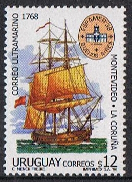 The Packet La PRINCESA the vessel depict on the stamp sailed for the first time from La Coruna in this mail service on 17 December 1767, sailed again from Montevideo on 18 June 1768 and arrived La Coruna on 24 September 1768. I believe the ships were special built for this service, but could not find any detail on this packets. The Captain of the La PRINCESA was Cayetano Antúnez.