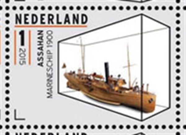 This stamp shows us the wooden yard-model of the Dutch gunboat Hr Ms ASSAHAN.