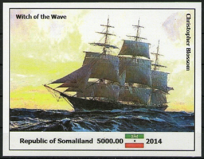 Witch of the Wave was a long-lived extreme clipper in the California trade, with a sailing life of over 34 years. She held the record passage from Calcutta to Boston. The Witch of the Wave registered 1494 tons, and measured: length 202 feet, breadth 40 feet, depth 21 feet, with 40 inches dead-rise at half floor. Her mainmast was 90 feet and her mainyard 81 feet in length. Though built at Portsmouth, she was owned by Captain John Bertram and Alfred Peabody, of Salem, and was the pride of that ancient seaport. It was usual in those days for owners to entertain on board their ships when favorable opportunity offered, so the trip of the Witch of the Wave from Portsmouth to Salem to obtain her register was made an occasion of festivity. Her figurehead was a young woman in a flowing white gossamer dress, with gold. One arm was extended, and she stood atop the crest of a wave in bare feet. The stern ornament was a seashell with a child, being drawn by dolphins. Both decorations were designed by John W. Mason, of Boston.The cabins and staterooms featured luxurious finish work, "the wainscot of the main cabin being of rosewood, birdseye maple, satin and zebra wood, exquisitely polished, with cornices and mouldings of white and gold." Witch of the Wave set the record for the passage from Sand Heads, Calcutta, to Boston—81 days, in 1853. During this passage, Witch of the Wave also tied a record set by the clipper Typhoon—37 days from Calcutta to the Cape of Good Hope. On January 23, 1853, Witch of the Wave put into Singapore, just nine days out from Hong Kong. She had sustained damage to her rudder as the result of a collision with the barque Spartan. On August 16, 1853, Witch of the Wave left Boston bound for San Francisco as a participant in a race with six other ships. She sailed the voyage under Capt. Lewis F. Miller and arrived in San Francisco after 117 days, beating the Raven, the Comet, and the Trade Wind. Six clippers in all arrived in San Francisco within 30 hours of Witch of the Wave, the other two being Mandarin and Hurricane. In 1855, Witch of the Wave was renamed the Electra by new owners in Amsterdam. She was still listed in Amsterdam in 1871, with Van Eeghen & Co. as owners. The design stamp is made after painting of Christopher Blossom.