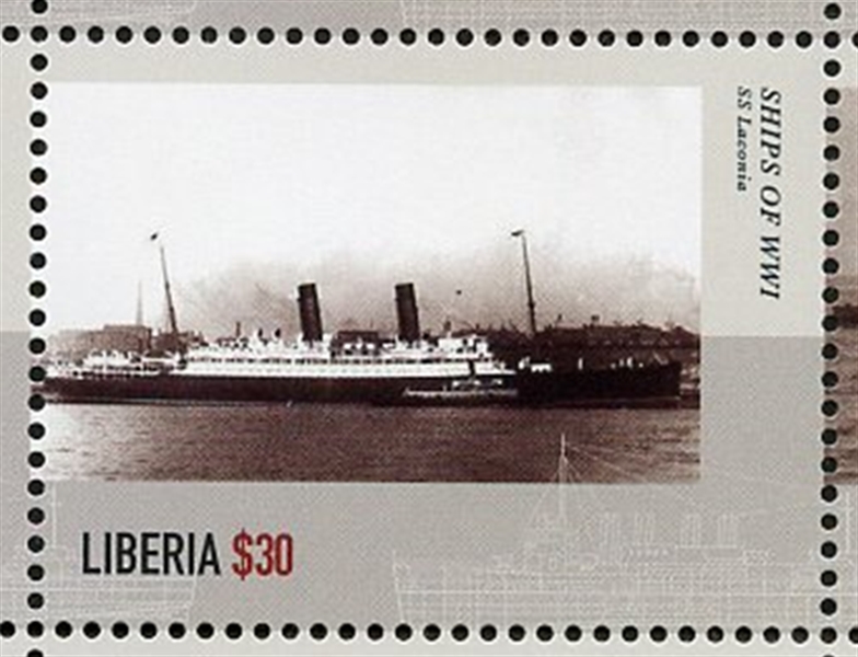 On the outbreak of World War I LACONIA was converted into an armed merchant cruiser in 1914 and based at Simon's Town, South Africa in the South Atlantic, from which she patrolled the South Atlantic and Indian Ocean until April 1915. She was then used as a headquarters ship for the operations to capture Tanga and the colony of German East Africa. She continued to serve on the East Africa station, before returning to the UK with a convoy in June 1916. She was handed back to Cunard in July 1916 and on 9 September resumed North Atlantic service.