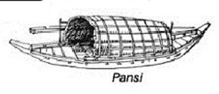 Water-taxi, fishing boat, ferryboat, and produce carrier of the Ganges River and Delta. Carvel planking fastened with staples; sides teak, bottom ironwood; rounded hull without keel. Long, overhanging spoon bow and stern formed from heavy, squared stem and sternpost; bow low, stern higher and broader. Generally undecked except at the ends. Those carrying jute and rice have a large, built-up house; cargo area lined with tin sheets; sides and roof of bamboo. Passenger panshis have a cabin with sides of wood or tin; a large type may be called a kuthir-pansi. Steered with either an oar or tall, balanced rudder; steering platform built above the cabin. Rowed by 6 oarsmen seated forward,poled,or sailed, setting 1-2 square sails. Average 5-6 in crew: Reported lengths 6-20m; West Bengal fishing panshi length 8.2m, beam 2.28m, depth 0.9m; shallow draft. The Pabna panshi is a long, narrow boat used in local: boat races.