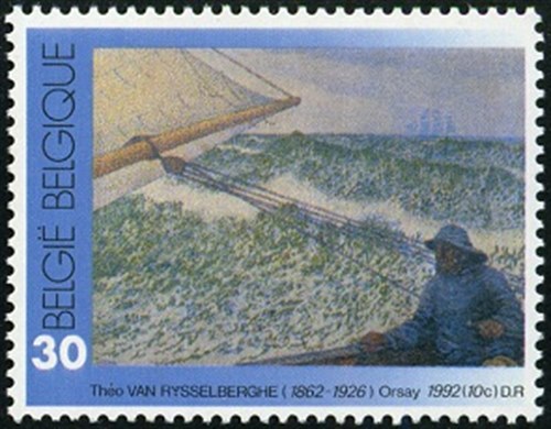 The stamp shows us a painting made by the Belgium painter Theo van Rysselberghe (1862-1926) and shows us a man on the helm of a partly visible sailing vessel, while in the background you can see what looks like a barque rigged vessel. Not any information on the ships depict.