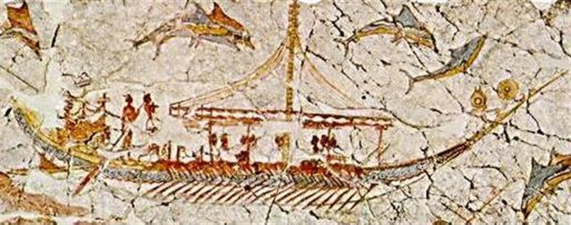 Paintings that was found in Acrotiri in Thera (Santorini) show that the Minoans used various types of ships. The Minoans were the first navy power in Greece (that no palace fortifications were found is a sign of their sea-power. Various types of Minoan ships probably used around 1500 BC. The paintings are parts of a Fresco discovered by the Greek archaeologist Spyridon Marinatos in “Acrotiri”. Interesting is that there is no waterline visible and the ships look as floating over the water.