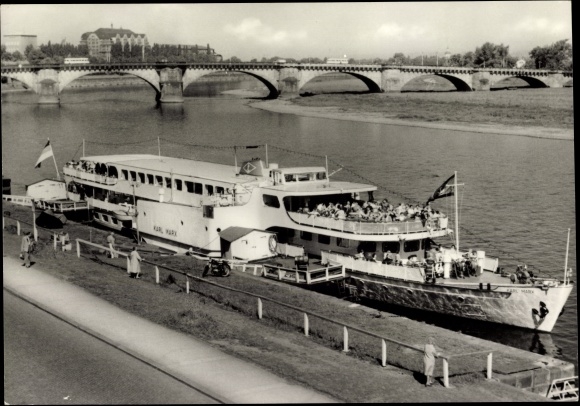 Sidewheel passenger ship, L:69,91m. B:7,80m./13,30m. Draught:0,84m. empty, 1,33m. loaded, 2 Karl Liebknecht diesel engines each 270 hp. 2 VEB Elbtalwerk Heidenau electric engines each 125 kW. passengers:750.
