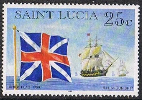 The stamp issued by Saint Lucia as given on the stamp as a R.N. 64 gun ship, what is known in the British Royal Navy a Third-Rate ship-of-the-line. The identity of the vessel depict is not known.