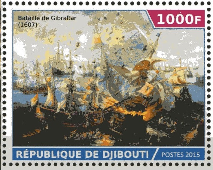 The naval Battle of Gibraltar took place on 25 April 1607 during the Eighty Years' War when a Dutch fleet surprised and engaged a Spanish fleet anchored at the Bay of Gibraltar . During the four hours of action, most of the Spanish ships were destroyed. A Dutch fleet of 26 warships was led by Jacob van Heemskerk . The Dutch flagship was Æolus . Other Dutch ships were The Tiger,The Seal,The Griffon,The Red Lion,The Gold Lion,The Black Bear,The White Bear and The Morningstar. A Spanish fleet of 21 ships (according to the Dutch) or 10 ships (according to the Spanish), including 10 galleons , was led by Don Juan Álvarez de Ávila . The Spanish flagship St Augustine was commanded by Don Juan's son. Other ships were Our Lady of Vega and Mother of God. The Spanish fleet was covered by a fortress, although the Dutch fleet was out of range of its guns at all times and they could not intervene in the battle. Van Heemskerk left some of his ships at the bay entrance to prevent the escape of any Spanish ships. Twenty from the Dutch fleet were ordered to focus on the Spanish galleons while the rest attacked the smaller vessels.Van Heemskerk was killed during the first approach on the Spanish flagship as a cannon ball severed his leg. The Dutch then doubled up on the galleons and a few of the galleons caught fire. One exploded due to a shot into the powder magazine. The Dutch captured the Spanish flagship but let it go adrift. Following the destruction of the Spanish ships, the Dutch deployed boats and killed hundreds of swimming Spanish sailors. The Dutch lost 100 men including admiral Van Heemskerk. Sixty Dutch were wounded. Depending on the sources, most or all of the Spanish ships were lost and between 3500 and 4000 Spaniards killed or captured. Álvarez de Ávila was amongst the dead. The design stamp is made after painting of Cornelis Wieringen