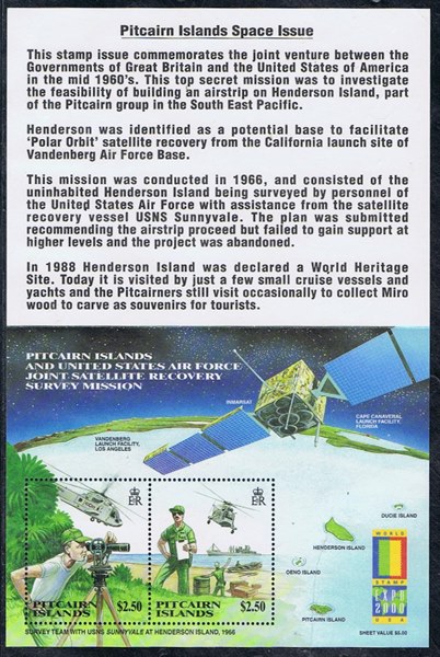 The sheetlet to celebrate the Pitcairn and United States Air Force Joint Satellite Recovery Survey Mission to Henderson Island is released on 7 July 2000 to mark the opening of the World Stamp Expo at Anaheim, Los Angeles where we will be operating a booth. The Expo is centred on the theme of Space Exploration and Travel, a topic, which has some significance to Pitcairn. Initially we intended taking a Millennium Part III stamp and developing it into a sheetlet for the exhibition, which is why both of these issue have the same date of issue.