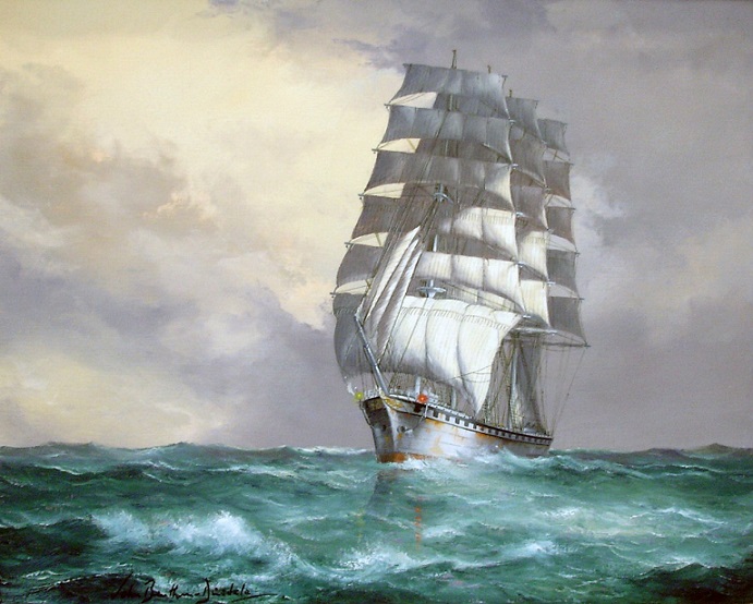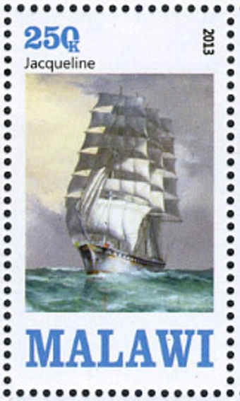 A splendid four-masted steel barque, the Jacqueline a representative vessel of French build, launched in February 1897 from the yards of Forges et Chantiers de la Mediterranean at La Seyne for the wealthy firm of Paris shipowners A D Bordes and Sons and registered at Dun-kirk. Rigged with royal sails over double top and topgallant sails. Used in the South American nitrate trade.The vessel is from Marseilles and has done some fine sailing. She left on May 23,1897 sailed from Mareilles to Australia with a cargo of tiles, she had contrary weather to clearing Gibraltar June 10. After that crossed the equator July 1 in 32 38 W. Poor S E trades were met. On July 8 in 17° S , the new ship was hove to in a S S W gale for 30 hours, and it was nine days later when thev shaped east.Then commenced some excellent running. Captain Leonetti, having a new ship under himn was anxious to find what she was capable of doing with the result that tho ship is stated to have logged 15 knots per hour for four days.The prime meridian was crossed on July 24, and S S W to N W winds were carried right along to August 21 to Tasmania. Here she was becalmed and met with head winds,but it will be seen that the ship sailedI from Greenwich meridian to Tasmania in 28 days, or over 5 degrees per day right through or a 13 knot speed for the 28 days. After a most tedious time off Tasmania she picked up a sou'-wester on September 1. On that date at 8pm a sailor named Sahun fell overboard from the foreyard, A lifebuoy was thrown, and it was caught, and the man was rescued under circumstances given elsewhere. A fine run was made up the coast. The ship is an excptionally fine one being fitted up for saloon passengers in very handsome cabins which are aft, and are constructel of mahognnv, birdsoyo maple and violet ebony. The cargo-workmg appliances and the navigating deck gear are of tho most modern labour-saving kind. A running flying bridge from the poop to the foremast is built over all and the crew have most comfortable quarters in deck-houses. There are two engines - one for cargo working and tho other connected with the ballast tanks and with condensing apparatus. She is 322ft long, 45ft 7in beam and 25ft 4in deep and it is an ideal of the proportions of this most handsome vessel. 1906 sailed from Barry to Iquique in 72 days. 1907 towed against the Loup lighthouse in the Bristol Channel by two tugs which straddled the lighthouse. The Jacqueline damaged the bowsprit which was repaired at Falmouth. 1917 July 1 Left Iquique under Captain Y. Niolas with a cargo of nitrate for La Pallice. 1917 September 25 The British steamship Victoria warned the captain of the Jacqueline for submarines in position 46°25'N, 13°10'W. After the war it was established that she had been sunk by the German submarine U-101 in the Bay of Biscay the following morning. The design stamp is made after painting of John Bentham Dinsdale. .