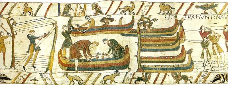 The five men working over the nearly completed pair of ships raise questions. The two shipwrights in the foreground, hammering nails, are bearded; and so in the art form utilized in the Tapestry to portray with stereotypes they could be Englishmen. If so, then William had perhaps more support in England itself than has been accepted. If he knew that the commoners were divided in their opinions about him, it would have given encouragement in the belief that his enterprise actually was practical of success.