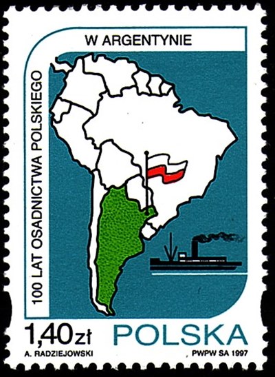 The stamp shows us a chart of Argentine with a stylistic image of a steamship. Not a name of the ship is given, but most probably the vessel depict is a German ship, most Polish emigrants sailed from a German ports to Argentine.