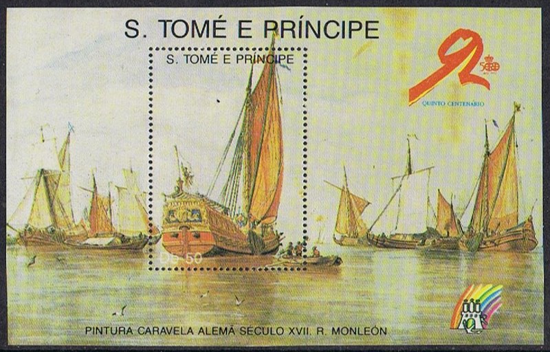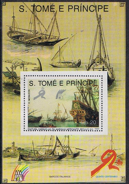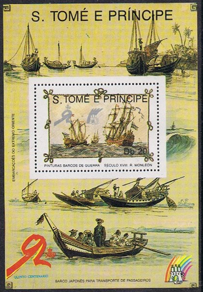 St Thomas and Prince Islands issued in 1989 a set of five stamps and six miniature sheets al with paintings made by the Spanish painter Rafael Monleón y Torres https://en.wikipedia.org/wiki/Rafael_Monle%C3%B3n and in the margins of five miniature sheets drawings of ships and boat types around the world.