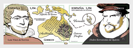 The stamp's design shows the silhouettes of Luis Vaez de Torres and Pedro Fernández de Quirós in colour against the faux-wood paper background.