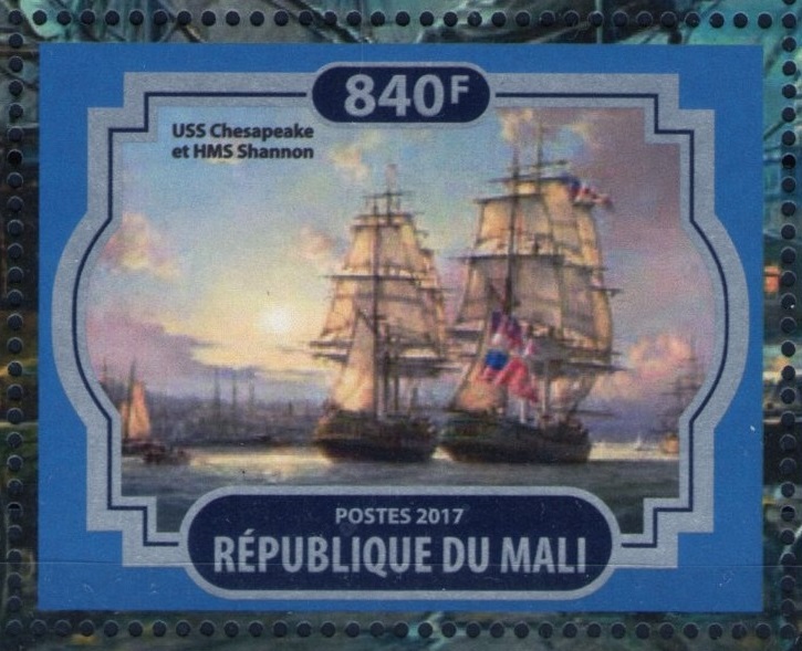 The stamp design is based on a painting by W. Elmes: "HMS 'Shannon' in action with the American frigate 'Chesapeake', June 1, 1813."