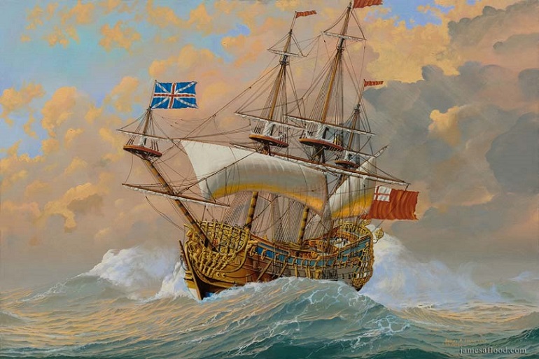 Gracefully reflecting the cavalier era of the late seventeenth century, this magnificent 100-gun battleship of King Charles II is depicted on the picture of artist James A Flood, when “Britannia” under the command of Lord Russel, seeking the French fleet in 1692 following the Battle of Barfleur.