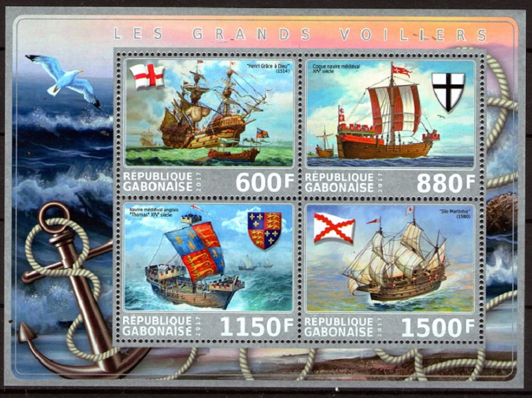 There were a number of common ship types in medieval Europe. Ship designs produced by different cultures were influenced by such things as intended uses (e.g human transport, short-distance trade, long-distance freighting, combat), the depth and roughness of waters to be traversed, character of local coasts and harbourage, kinds of wood available, traditional techologies and design solutions, and a general trend towards building ships that were larger, yet better able to cope with the stresses of oceanic sailing. In broad terms a distinction has been made between ship types developed in northern Europe and those constructed by Mediterranean countries. But as merchants from all over Europe sought commercial opportunities further afield, knowledge of different design solutions spread and there was cross-fertilization between the various ship types. Тype of ship, the cog, derived from a barge-style fat-bottomed boat, developed in response to the need for merchant vessels able to transport bulkier loads. It was employed effectively by the towns of the Hanseatic League in particular, as they captured a prominent role in international trade (particularly the cloth-making industry focused in the Low Countries, whose waters were shallow). Merging the best features of southern and northern ship types continued in the fifteenth century. Northern builders had realized, towards the close of the previous century, that steering and wind propulsion were improved by an additional mast above the aftcastle, carrying a lateen sail; this second mast became a common feature of new ships during the fifteenth century, and some ships were fitted with a third mast and sail, above the forecastle. As the result of the convergence, the predominant type of ship by the late fifteenth century was the carrack. In addition to the changes indicated above, a distinctive feature was that fore and aft castles were designed as integral parts of the hull. Rigging became more elaborate; for instance, the foresail and foremast were steadied with the help of ropes attached to a bowsprit projecting from the forecastle; the bowsprit might support a yard-arm bearing a small sail. Hull modifications were also made to support heavier artillery. On the sheetlet of Gabon depict medeval sail ships: