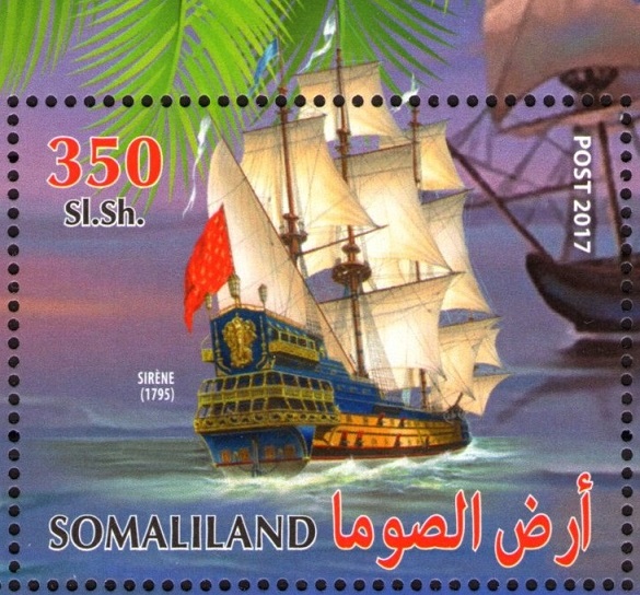 A French ship of the 17th century – «La Sirene»- 60 guns (launched 14 January 1691 at Bayonne) – captured and wrecked in the Battle of Vigo Bay in October 1702. The stamp indicates the date 1791 is a mistake, since ships of this design, at the end of the XVII and the beginning of the XVIII century, were no longer built.