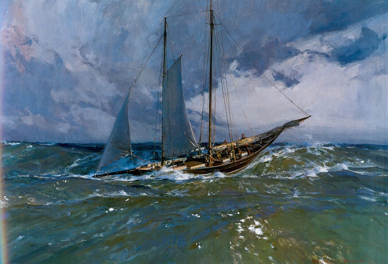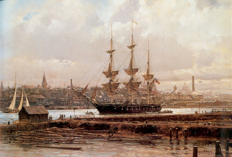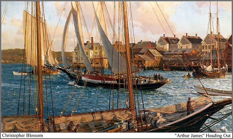 When a child has a father and grandfather who are both well known illustrators, it is likely the offspring will also become an artist. And when a boy starts to sail at the age of six, it is also likely that the artist might choose the sea and sailing ships as his subject. Such was the case for Christopher Blossom, who, by the time he left the Parsons School of Design and Robert Bourke’s Design Studio, could visualize a finished boat from only its plans—and draw the craft from any angle. Before Blossom was twenty, he had sailed under square rig aboard the brigantine Young America. Known for his complex, detailed compositions of ships at sea, Blossom combines his appreciation for the beauty and the menace of the sea with his love of maritime history and ship construction. Before Blossom paints a vessel, he is likely to study the ship’s blueprint to learn about it hull design, length, tonnage and deck layout. Blossom’s historically accurate ships and harbors are combined with color, light and composition to capture the mood of a voyage and convey the essence of the seafaring experience. At the age of twenty, he won a Gold Medal at the Society of Illustrators Scholarship Exhibition. His dual vocation of experiencing the sea and then painting both nautical history and some of the greatest modern places to sail, was truly launched. Blossom became both a charter member and an artist of the American Society of Marine Artists, serving as its president from 1983 to 1986. His awards include a Gold Medal from the National Academy of Western Art for his painting of ships in Monterey. Saluted as an undisputed master, Blossom has exhibited his art at the Gilcrease Museum, the Colorado Museum of History, the prestigious Prix de West Invitational and the Artists of America show. Blossom continues to achieve artistic honors including the Robert Lougheed Memorial Award at the 2001 Prix de West. Almost the only time he isn’t painting is when he is sailing, visiting ports of call in Maine, Connecticut, Rhode Island, Maryland, the Bahamas, California and Washington state. Blossom, who recently spent a year sailing around the Caribbean with his wife and two sons says of his love, "It’s not a hobby, it’s a way of life. When I look at the ocean, I get the same feeling pilots must get when they look to the sky." On the sheetlet shows the pictures: