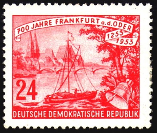 For the 700th Anniversary of Frankfurt on the Oder. East Germany used one stamp of 20 Pf which shows us the old town of Frankfurt on the Oder seen from the Löweninsel (Lionisland).
