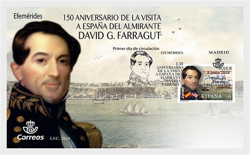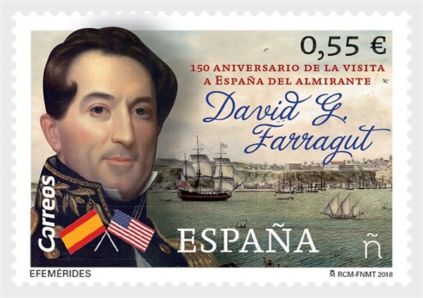 Spain issued one stamp in 2018 for the about 150th Anniversary of Admiral Farragut's Visit to Spain, the stamp shows a portrait of the Admiral and in the background details from a 17th century painting which shows some sailing vessels of the 17th century of which I have not any info.