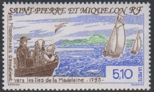The stamp issued in 1993 by St Pierre et Miquelon shows the people leaving by most probably fishing boats St Pierre et Miquelon after the British captured the island on 14 May 1793 and the people living there were deported. In the background of the stamp, the island is visible, and the people in the first boat are looking for the last time to the island.