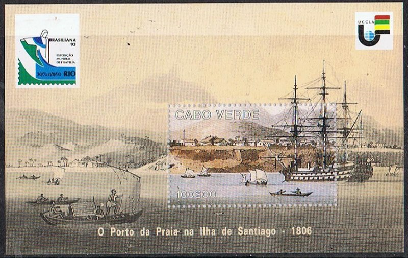 For the International stamp exhibition Brasiliana “93” at Rio de Janeiro, Cape Verde issued in 1993 one miniature sheet which shows us Porto da Praia on Santiago Island, Cape Verde in 1806.