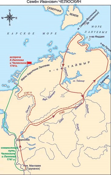 Chelyuskin Semyon Ivanovich (c. 1700-1764), Russian navigator, captain of the 3rd rank. From an old noble family. He studied at the Mathematical and Navigational School and the St. Petersburg Maritime Academy. In 1726 in the fleet as a sub-navigator, in 1733 he was promoted to navigators and assigned to the Great Northern Expedition V.I. Bering, in which he stayed until 1742. First, he was in Pronchishchev's detachment, after whose death he took command of the «Yakutsk» ship, then in Detachment X. Laptev. Participated in the study of the coast of the Arctic Ocean from the mouth of the Lena to the Yenisei. In the spring of 1741 passed by land from the river. Khatangi to r. Pyasina compiled a description of the western coast of the Taimyr Peninsula to Cape «Sterlegov». In the winter of 1741-1742, he traveled by dog sled from Turukhansk to the mouth of Khatanga, then compiled a description of the entire eastern coast of Taimyr to the northernmost point of the mainland, named after him (Cape «Chelyuskin»).