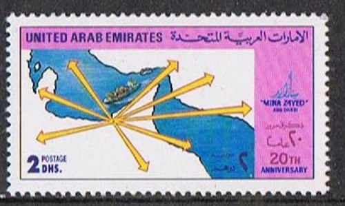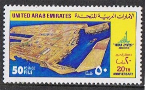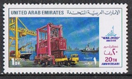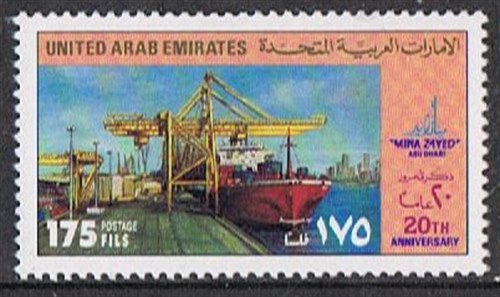 For the 20th anniversary of the Zayed Sea Port in Abu Dahbi, the United Arab Emirates (UAR) issued four stamps, which depict the port and cargo and container ships in port.