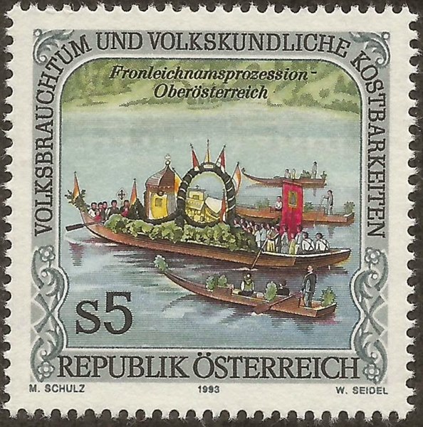 Corpus Christi is a time when the people of Hallstatt decorate their traditional boats with flowers and foliage, and the village is prepared for a special celebration. The festivities date back to the Jesuits who formed colorful processions through the village. Due to the fact that there was limited open space in the old salt-mining village, the walking procession was replaced by boats and salt-carrying small ships on the lake. This afforded the local people some lovely views towards the "salt mountain" which had been their source of income for thousands of years.