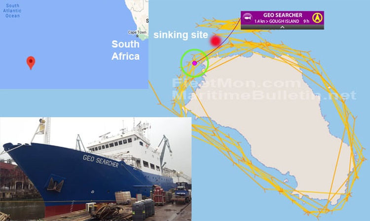 Research ship GEO SEARCHER reported sinking, 62 crew abandoned the ship at around 1030 UTC Oct 15, 2020, about a mile off northern coast of Gogh Island, volcanic island in the South Atlantic Ocean, dependency of Tristan da Cunha. Judging from ship’s track, GEO SEARCHER was engaged in some research in island waters. Hopefully, all 62 crew and personnel managed to reach the shores.